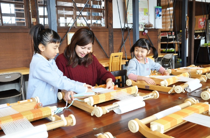 体験コーナーでは、家族で機織りやまゆ玉クラフトなど