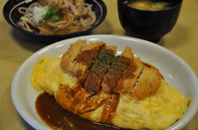 ご当地グルメのおろしそばもボルガライスも食べたい人にぴったりのセットメニューは「たけふグルメセット」。オムライスの中にはうどんが入りもっちり食感でおすすめ。