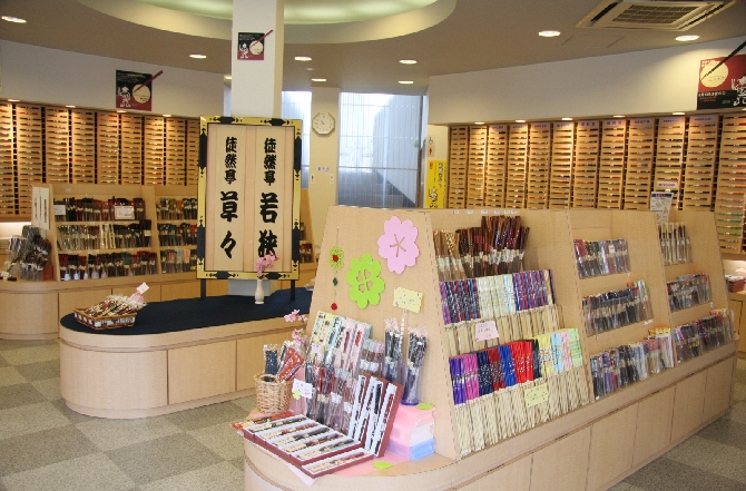 館内には3,000種類の箸の展示・販売のほか、塗り箸の