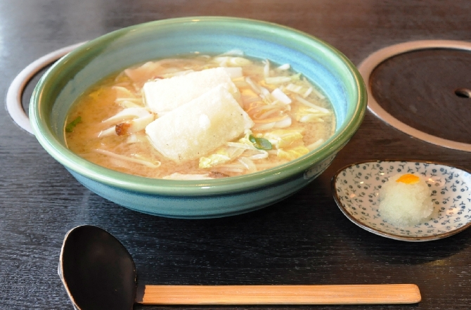 野菜もたっぷり入ったみそ味ベースのダシで食べるうどん。