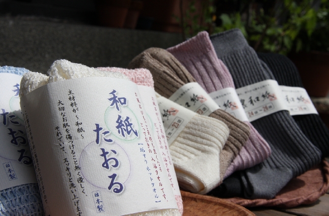 主原料に「和紙」を使って織り上げた、お肌にやさしいアカすりタオル。