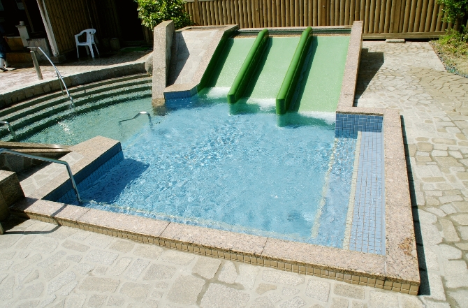 子どもが大好きなすべり台風呂や、源泉かけ流しの陶器風呂、