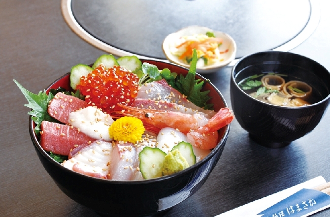 旬の新鮮な魚を乗せた丼ぶりは、県産のお米、醤油を使用しています。