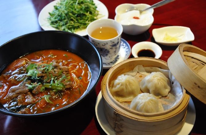 小龍湯包、豆苗炒め、杏仁豆腐、中国茶がセットになった御膳。