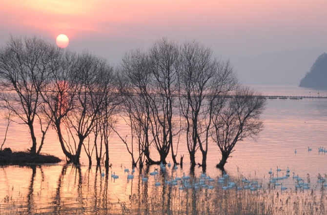 初冬になると夕陽とともにコハクチョウやオオヒシクイなど