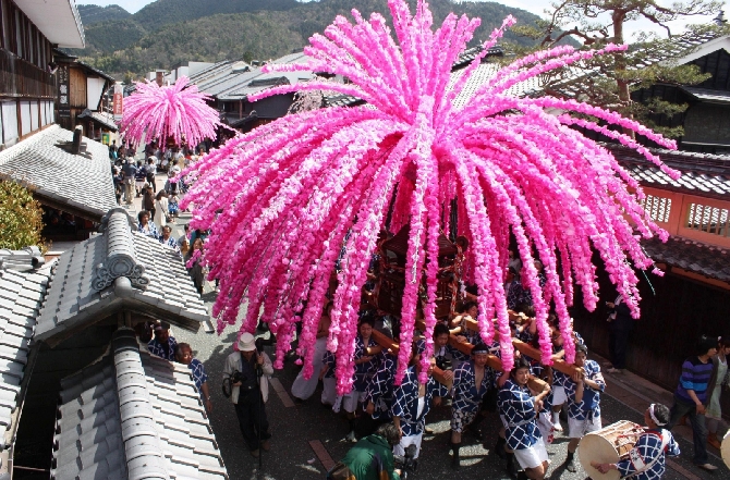 美濃和紙で創られた桜色の飾りをゆっさゆっさと揺らしながら、「オイサッ オイサッ」のかけ声に合わせ神輿が町を練り歩きます。