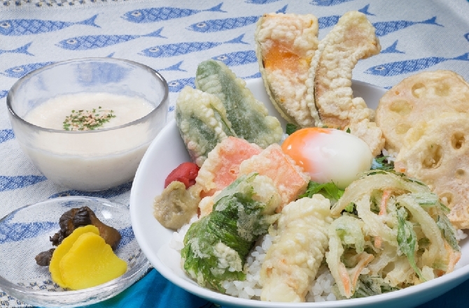 若狭名物ふぐ、自家栽培の米とたっぷり野菜のオリジナル丼。特製だれのかかった天ぷらに、とろろソースをかけるとまた違った味わいに。若狭湾が一望できる最高のロケーションでどうぞ。お酒やスイーツも楽しめます。