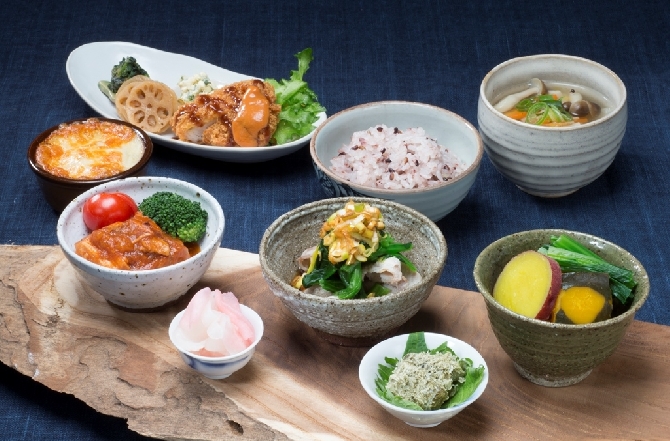 地元の季節野菜を使った色とりどりのおかずに野菜スープ、古代米ごはんがついたヘルシーセット。青葉山の風景とともに、高浜をたっぷりお楽しみください。「しめ鯖のおきな和え」の他、季節ごとのデザートも人気!