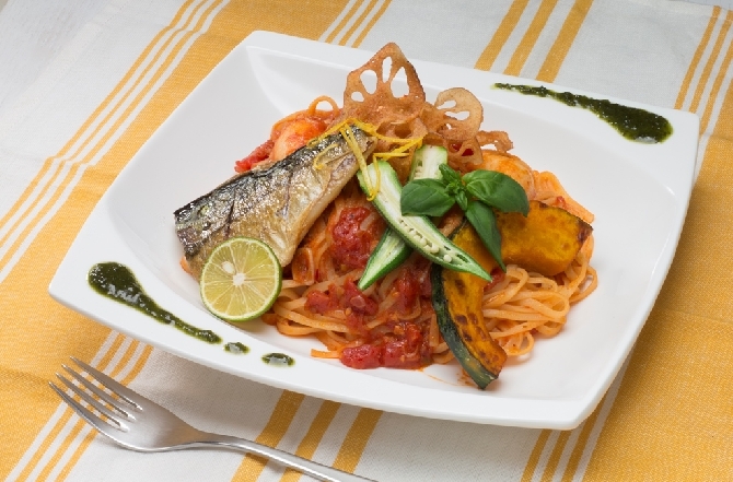 当店名物「生パスタ」と若狭名物「焼きサバ」のコラボレーション!脂ののったサバをオイル系・トマト系・クリーム系のどのソースにも合うように工夫。旬野菜もそれぞれ調理法を変え、徹底して生パスタ・ソース・具材のバランスにこだわっています。店内にはカラオケBOXもあり、食事、お酒も楽しみながらパーティーができます。