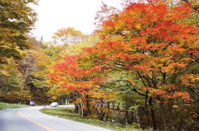 街道沿いのナラやブナなどの広葉樹が美しい。四季折々に大自然を満喫できます。