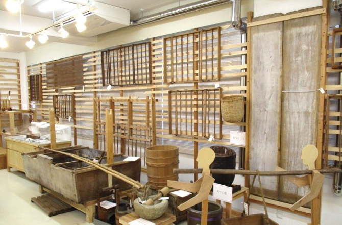 美濃和紙の製造に欠かせない簀子や桁などの用具類をはじめ、農具、漁労具、家具などの民具類を展示。