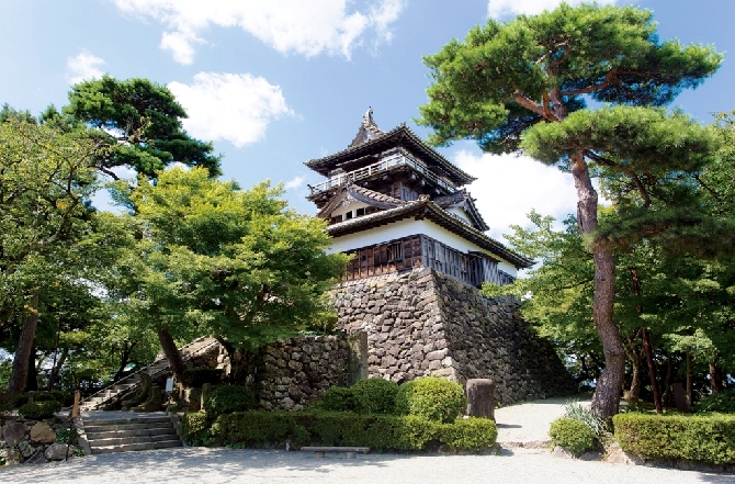 丸岡城(霞ヶ城)は、天正4(1576)年、柴田勝家の甥、勝豊によって築かれ、国の重要文化財に指定されています。現存する天守では最古の建築様式を持つ平山城で大入母屋の上に廻縁のある望楼をのせ、屋根には笏谷石製の石瓦を使用。