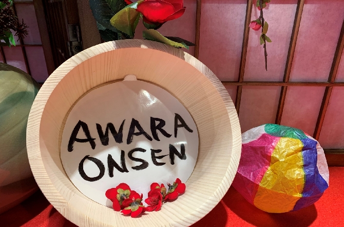 あわら温泉を盛り上げるため、京都外国語大学グローバル観光学科の学生たちが企画。色とりどりの和傘を飾り、大正ロマンを感じさせるレトロな空間を作りました。あわらの旅の思い出の一枚を「あわらロマン館」でぜひ!
