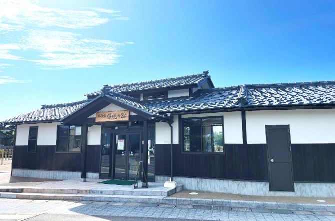散策ルートなどの情報発信の拠点施設。二つの県を跨いだ施設は全国的にも珍しく、玄関の中心が県境になっています。