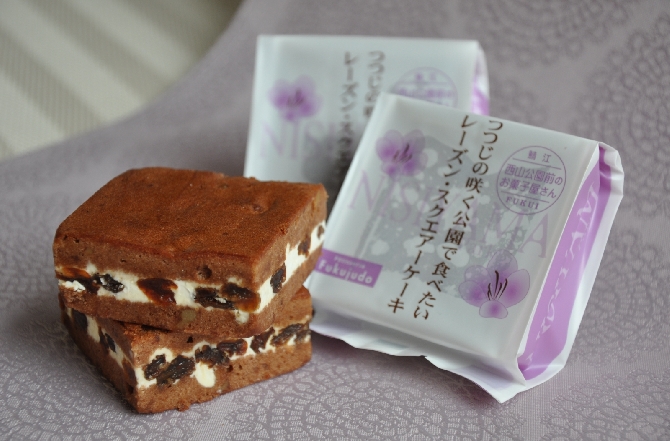 ココアとくるみのはいったバターケーキにラムレーズンとバタークリームをサンドした「スクエアー」は洋酒のきいた大人の味。