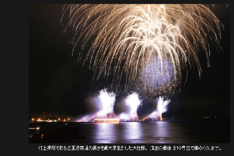 三国花火大会の花火師は長野の伊那火工堀内煙火店さんが打上を行なっています。創業は明治32年というとても歴史がある花火店で、日本のあらゆる花火競技大会で数々の賞を受賞しており、長野オリンピックでも打上を行なっている花火店です。毎年、三国花火大会だけのために一玉一玉手作りを行なっており、また、三国だけでしか見ることのできないのオリジナル芸術花火を製作していただいています。総勢30名の花火師が三国港突堤や水中花火船から皆様に喜んでいただくため、命がけで従事しています。